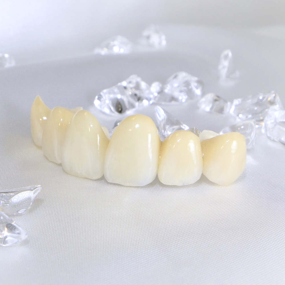 リスクや副作用:型どりの際に歯を削る必要があり、治療時に出血を伴うことがあります。歯の状態によっては神経の治療が必要になる場合があります。また、装着後に噛み合わせの不具合で違和感が生じる場合や、歯ぎしりや噛み締めによる過度な力で割れるリスクがあります。