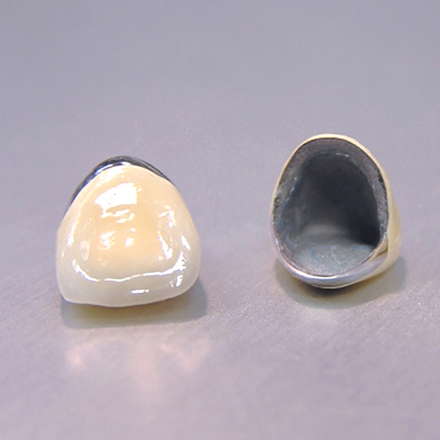 金属製の被せ物の外側に白いセラミックを焼きつけて作製する被せ物です。内側に金属を使っているため丈夫な点が特徴です。